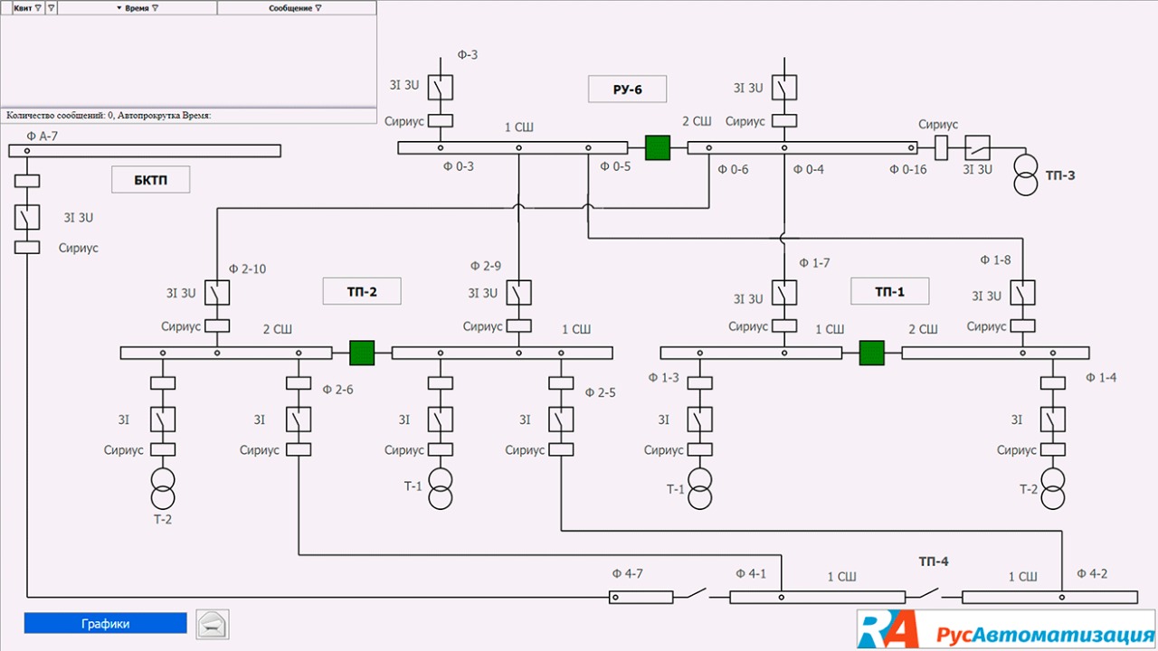 - реализовать четыре вкладки для БКТП, РУ-6, ТП-1, ТП-2, в которые можно было перейти из общего вида ИИС;